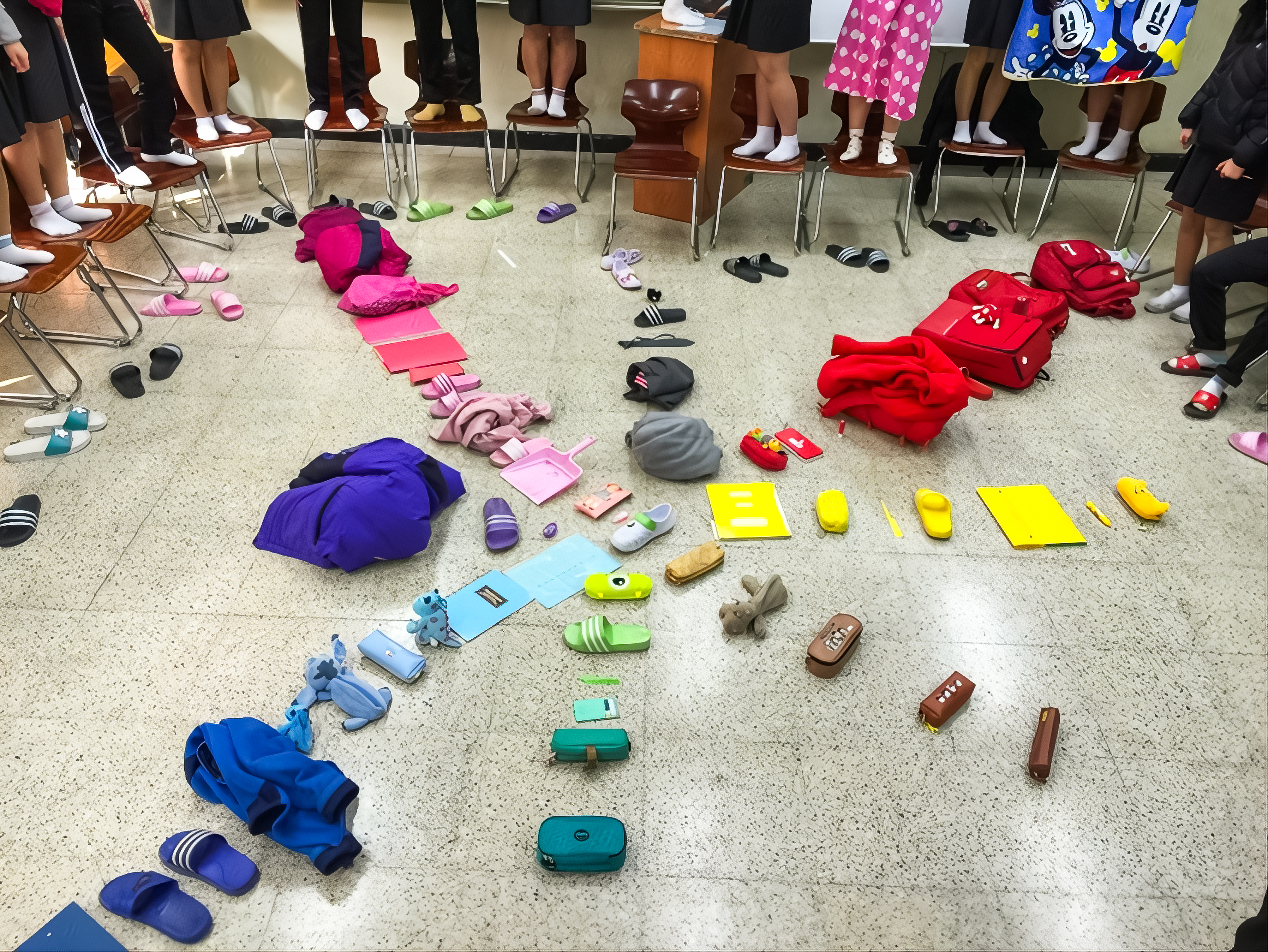 아이들은 점퍼, 가방, 필기도구, 슬리퍼까지 각양각색의 물건들을 조심스레 교실 중앙에 꺼내 놓습니다. 망설이던 아이들도 친구들의 물건들이 쌓여가는 모습을 보며 즐겁게 참여하기 시작합니다. 어느새 교실 바닥은 형형색색의 물건들로 채워진 하나의 거대한 팔레트가 됩니다.